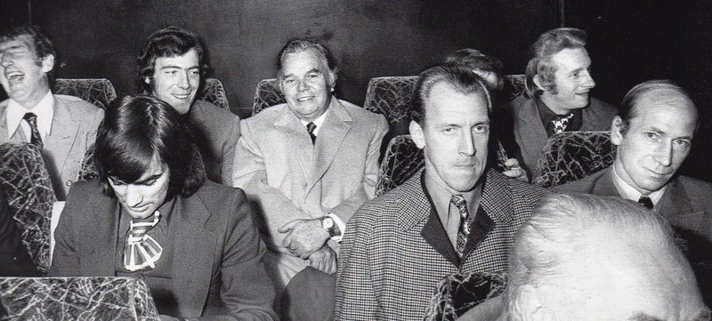 A visit by a later Man Utd team in 1971. Team members in this photograph include George Best on the left, Bobby Charlton on the right, with Denis Law in the back row behind him. In the centre is Jersey resident Sir Billy Butlin