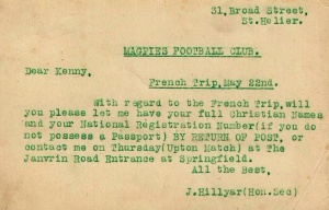Magpies FC 1925-26. Back row: E Hall (secretary), W Cummings, M Ryan, C Mason, I Martin, E de Ste Croix (treasurer); Middle: A Martin, F Bourke, B Perree, P Bassett, S E Ahearn; Front: A Honeycombe, S Ahearn, C Beuzeval