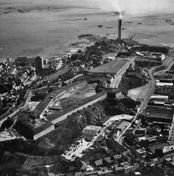 An aerial view of Fort Regent in the 1950s