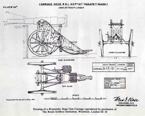 ecause of the requirement to master a high parapet, it was unavoidable that the guns would be top-heavy laterally to an extent that would easily capsize them on irregular ground. This was readily understood and, in fact, the guns were lowered from their firing positions for transport, the trunnions resting in shoes further down the trail.