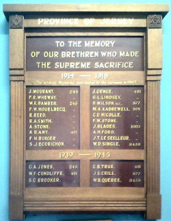 The only private memorial to islanders who lost their lives in the Great War is in the Masonic Temple in Stopford Road.It lists 20 Freemasons who fell in the conflict, and a further six who died in the Second World War. Six of these are not known to have any Jersey connection, but may have been visiting members of the Freemasons while part of a Garrison Regiment, or staying in the island for other purposes