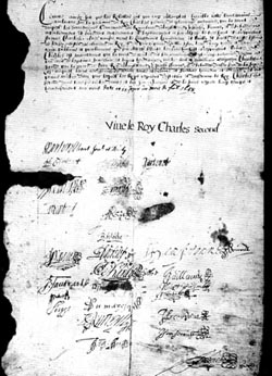 - "We the Lieutenant Governor and Bailiff and Jurats of this Island of Jersey, assisted by the King's Officers and by the principal inhabitants of the said Island, with one heart and voice publish and proclaim that His Highness, the Very high and pussant Prince Charles, has now by the death of our late Sovereign of glorious memory, lawfully become by right of legitimate succession and direct descent, our only and Sovereign Lord, Charles the Second, by the Grace of God, King of England, Scotland, France and Ireland, Defender of the Faith, etc, to whom we acknowledge our duty of implicit obe3dience and fidelity, nohour and service. And we pray God by whom Kings reign, to stablish and confirm King Charles the Second in all his just rights, and on his Throne, and to grant him a long and happy reign over us."
