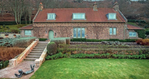 The cottage stands within its original garden with stone boundary walls. The garden is entered through a pair of tall granite gate-piers with triangular pinnacles that echo historic gateways in the Island. There are modern extensions and additions to the property. Historic features of interest to the interior are the main central room with its exposed timber beams and joists, a large dressed granite fireplace and stone arched doorways.