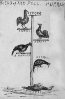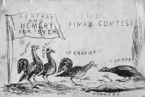 The five men in the chicken cartoons were all among the early deputies of St Helier. In the first election for Deputies in 1857 - three for St Helier and one each for the other 11 parishes - Clement Hemery and George Vickery were successful in St Helier, and Hugh Godfray in Grouville. The history books are silent on who the unsuccessful candidates were, and Google seems to believe that the only important Jersey election that year was in New Jersey. However, a check in the Jersey Independent of 14 January 1857 reveals that the other two shown in the cartoons - Jean Le Cronier and George Helier Horman, were not candidates, so these cartoons must refer to a later contest.