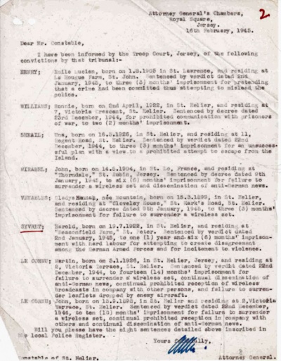 During their occupation of Jersey from 1940 to 1945 the Germans operated their own courts - military tribunals - and hundreds of islanders were brought before these courts for offences involving failing to surrender a wireless set, stealing food from the Germans, attempting to escape from the island, receiving goods stolen from the Germans, dissemination of anti-German information, and many other wartime offences. The records of these cases are now held by Jersey Archive and the documents are available to be viewed online by subscribers to their website. This is an index of those records, with index numbers which can be used to search for individual cases. The cases are presented in chronological order.