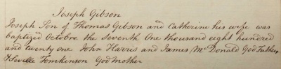 Joseph Gibson, son of Thomas and Catherine, was baptised in St Helier in 1821
