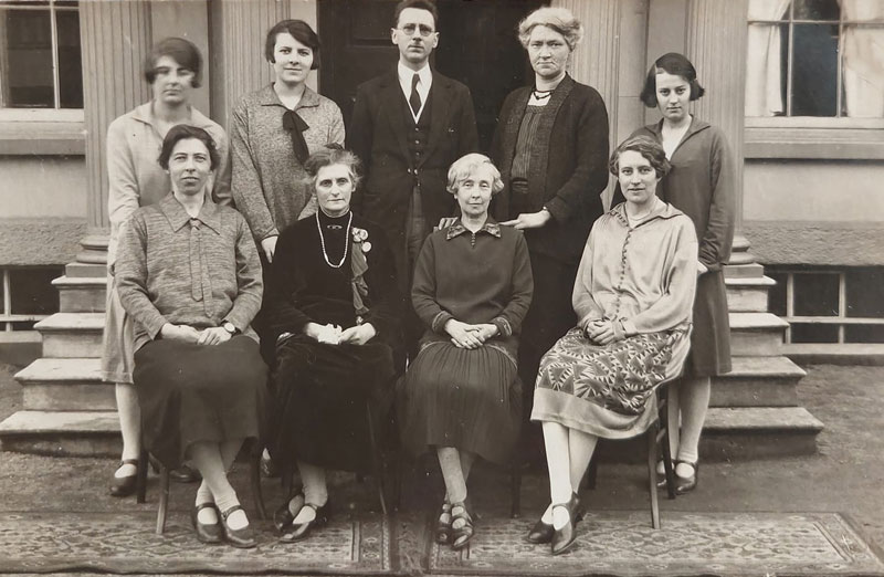 The teachers on 21 March 1927 - top row: Miss Esnouf, Miss Lyte, Mr Aubin, Miss Gayford, Miss May Croad. Bottom row: Miss Le Feuvre, Unknown , Miss Clough, Miss Hosking