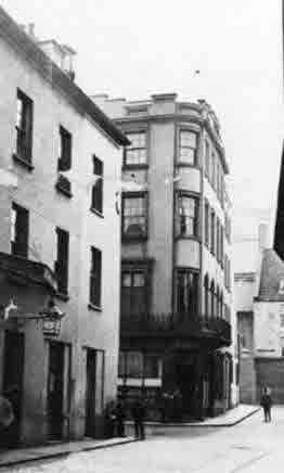 This is clearly the same building that is shown in the advertisement in the box on the right, though the date of this is unknown. It seemed strange that in the wake of the fire the hotel would have moved from the large premises in Church Street to a much smaller building in Hill Street, but the discovery of a further postcard indicates clearly that the hotel stretched from Hill Street right through to Queen Street - a relatively narrow but long site. It seems certain that this was the location of the hotel after the fire forced it to move from the Royal Square.