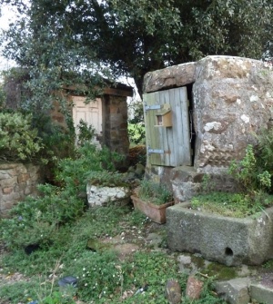 Rural house, two-storey, three-bay in roughly squared granite; window openings with long-and-short surrounds; doorway in third bay. To the right are two further irregular bays with brick surrounds. Wellhead to south is flat topped structure, round plan rubble wall with pierre perdu render. Opening to north face.