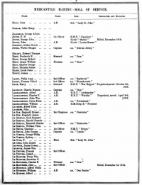 After the end of the First World War the States of Jersey created a list of all those islanders who lost their lives during the conflict, and in 1919 they published an official Roll of Honour. This document also included a Roll of Service, containing the names and units of those known at the time to have been in the armed services during the war. There was also a list of those who served in the Merchant Navy, then known as the Mercantile Marine. This page contains links to that Roll of Service.