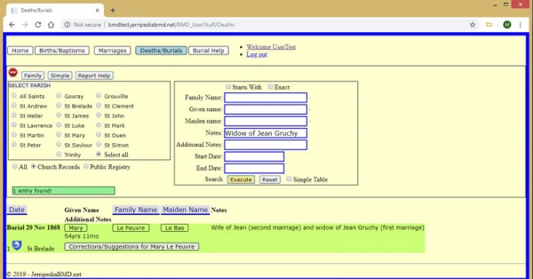 Here the search has worked for you, without adding anything other than Widow of Jean Gruchy to the notes field. You discover that Mary was born Le Bas, married Jean Gruchy, then Jean Le Feuvre, who she was still married to when she died in 1868 at the age of 54. A search like this may yield no results, it may yield many - search for Mary with just Gruchy in notes and you get 13 records, most of them for Mary whose mother was either a Gruchy or de Gruchy.