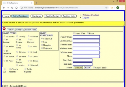 The only problem you might encounter if you are using the Family Search facility extensively is that the system will time you out of a search and return you to the main page. No problem! Just click on Baptisms, Marriages or Burials, where you want to resume your search and your original search criteria and results of the last search are still there. These results are even retained when you login again tomorrow!