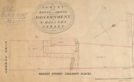 A plan of this building has recently come to light in the Government Archives at Mount Bingham. It was drawn in 1800 and is headed "Survey of House and Ground purchased for Government at St Helier's Jersey containing 1 acre 2 roods 16 perches 9 yards 8 feet. 1800."