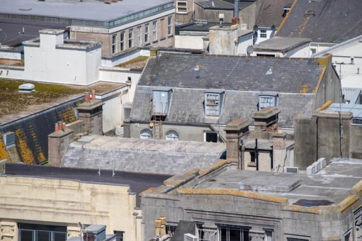 These two photographs taken from Fort Regent show the roof of the former Halkett House, which is still standing but largely incorporated into the commercial property surrounding it, formerly the Woolworth store. The roof of the building and its four chimney stacks are in the centre of both 21st century photographs. The picture on the left shows the top of the King Street facades of what were Woolworth (left) and Burtons The taller building behind Halkett House in the left picture was built in the 19th century and the lane running to the left of them was called Rue de Dinan.