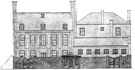 As Hottot wrote, elle existe encore, quoique mutilee. In fact, it stands behind the front of what was Woolworth's store in King Street. The ground floor has been taken out and is now occupied by shop counters; the upper floors are used as store rooms. The facade of the house was taken, a long time ago, pour deployer les splendeurs d'un bazar American, but the granite chimney stacks remain, as on the drawing, though the top four or five feet of one has been cut off. The existing window spaces also correspond in number and dimensions, though they are now inside the building (on the first floor) and are used as doorways.