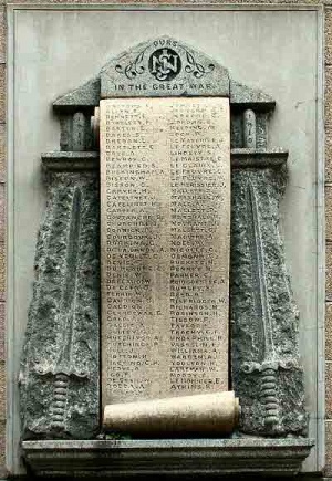 A memorial to former pupils of the school who died in the First World War was mounted on the Don Street wall of the school and has now been incorporated into the Library building in the same position. The scroll incorporates the initials 'JCN' for Jersey National School.