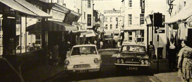 This picture was taken in the mid-1970s by Andre Ferrari, a noted campaigner for the preservation of St Helier's remaining original architecture. He comments:'This photo has acquired its own historic interest. Most of the opposite side of the street has been redeveloped. The ladder on the right shows work in progress on what was to become the House of Dupre - an upmarket, indoor stores-within-a-store concept. Jersey was starting to get a bit above itself, and they had a liveried gentleman at the entrance to welcome you in (I used to deliberately go through the place in my scruffy anorak for the pleasure of having the poor guy open the door for me!). But the real interest is the hanging sign in the top left: The Pantry! I still yearn for the smell of that shop and the taste of their pies! Who remembers the wonderful chicken vol-au-vents, with a sliver of tomato and sprig of parsley on top? The Pantry eventually got taken over. I think it was by Le Bruns, who were taking over everything (including the newer Hot Bread Shop around the corner in French Lane). And that was the beginning of the end...