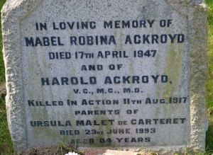 Ackroyd had no personal connection with the island, but his widow Mabel, who moved to Jersey after their daughter Ursula married into the Malet de Carteret family, of St Ouen's Manor, is buried in the cemetery at St Ouen's Church. Her late husband, whose body is believed to lie in Birr Crossroads Cemetery near Ypres, is commemorated on the gravestone.