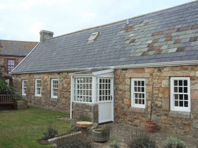 The garden is enclosed behind a low wall of rusticated granite, gate and granite pillars. The stable block has a slate roof, random stone construction.
