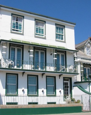 Early example of this building type which contributes to streetscape on a sweeping promenade. A pair of villas, now combined as hotel. Principal building is three-bay, three-storey with semi-basement (third storey added late 20th century with loss of original brick chimneystacks).