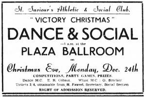 - Helier and Lizzie went to the Stadium on Boxing Day, when for the second day running there was a crowd of 700. But all went well; thanks to the very spacious dance floor and the fact that numbers were controlled by management, a fair dancing space was available for all. The Christmas decorations made a bright picture and the kids told us that everyone present enjoyed themselves to the music of Les and Ted Watson and the Watsonians, glowing under their new V sign. The new bandstand provided a gay splash of colour in a ballroom which is ‘getting better all the time’ in the way of interior decorations, whilst the floor was, as usual, in excellent condition. The management are entitled to congratulations for their excellent organisation of the first real Christmas programme for seven years.
