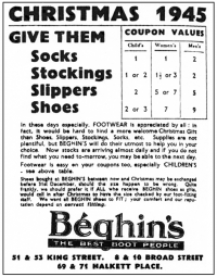 - And talking of Beghin's, they must be doing a roaring trade in shoes in the run-up to Christmas. We thought we would buy a pair each for my brother Jack, and Vera's boys. We can't really afford it, but they have been so good to us in the past five years with gifts of veg and soft fruit grown in their garden that it is the least we can do. We want it to be a surprise, but what size do we buy? Fortunately we see from their advert that Beghin's are offering a free exchange service up to the end of the year. If our presents don't fit, the boys just have to go and stick their feet in that X-ray thingy in the shop to find out exactly what length and width they need.