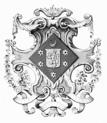 As borne by Mrs Clement Hemery: Sable, a crescent between five mullets of six points, pierced, or, On an escutcheon of pretension: Azure, a lion, rampant, errainois, ducally crowned, or, for Durell Crest of Hemery : A stag's head, argent Motto : Flecti, non fraugi