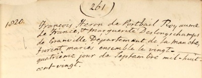 Francois Heron, of Portbail, married Marguerite Deslongchamps, of Granville in St Helier in 1821