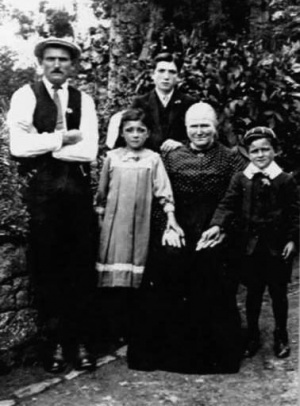 Marie Francoise Herve with four of her eight children by her first husband, Joseph Allenet - Joseph, Eugene, Doris and Alfred. She was born in Plelo, Cotes d'Armor, Brittany, in 1863, and married Joseph in Le Foeil in 1884. He died in 1899, five months after the birth of their youngest son. Marie Francoise came to Jersey with her six surviving children. Pierre Marie died in 1893 and Jeanne Marie in 1900, just before her mother left for Jersey. She married again to Honore Boschat at St Peter in 1903. He was born in the same area of Brittany in the same year as Marie Francoise. When first registered under the Aliens Act in 1921 she was said to be an invalid, confined to her room. Over the course of the next 12 years, until her death in 1933, she moved from Six Rues, St Lawremce, to Petit Menage, St Peter; Fair View, Val de la Mare; Welton Farm, Five Oaks; Stonewall, Mont au Pretre; and finally La Maitrerie Farm, St Martin. The last three moves were after Honore's death in 1928