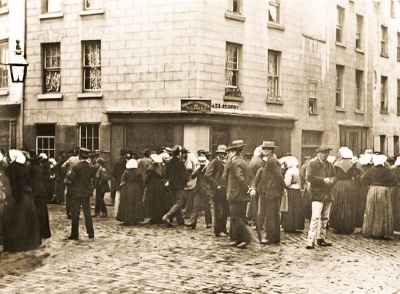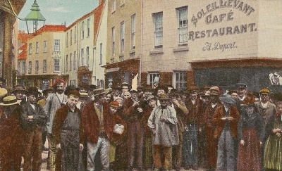 Breton workers outside one of their favourite haunts, the Soleil Levant public house on the corner of Hilgrove Street and Bath Street