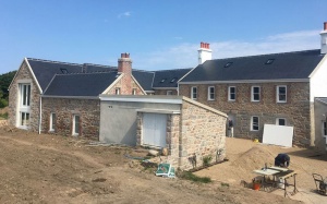 All outbuildings match with slate roofs and pierre perdu mortar.