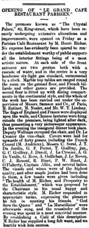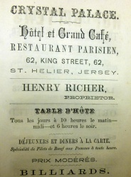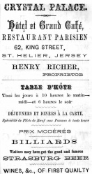 By 1885 Henri Richer was established at No 62 trading as Cafe Parisien. It is not clear whether the premises included the Hotel at this time but from 1900 onwards almanac listings show No 62 as the Hotel du Palais de Crystal and restaurant, with proprietor Jules Parison. There is some confusion about exactly which businesses occupied which number, because a hotel advertisement (below) clearly shows the hotel at No 62 and the Cafe Parisien in the 'adjoining' building. That is No 64, and from the 1870s right through past 1900 that building is shown as occupied by 'Mesdames Gruchy, milliners'. It has so far not been possible to establish whether they traded from a ground-floor shop or had premises above the Cafe Parisien.