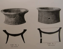 - Pottery: The remains of 19 pottery vessels, known as vase-supports, were excavated from the centre of the chamber. Some of these had decorative lines on them. It appears that the vessels were deliberately broken, perhaps as part of a ritual. The saucers show signs of burning, so they were used as lamps or for the ritual burning of offerings.