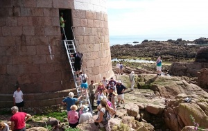 - "You also see that there are only three windows and the door (accessed by a long ladder as all these towers were). But why three windows? They were to enable the garrison to see and receive signals from the adjacent towers. Two on the north side appear to face Platte Rocque and Seymour Tower respectively, and the one on the west seems to point towards Noirmont Tower and Fort Regent and Elizabeth Castle. It must be remembered that without telephone or radio at the time, line of sight signalling was imperative, and General Don, Lieut-Governor of Jersey, as part of the massive military building programme at the time, included a network of signalling stations around the Island so that any invasion risk was quickly communicated.