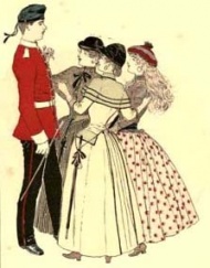 The little grape seller: En la voyant passer, plus d'un se dit tous bas: Le beau fruit! Mais trop verte, et bon pour les goujats! (Seeing her pass, more than one says softly: Beautiful fruit! But too green, and good for boors!)