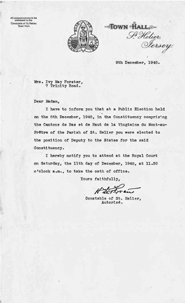 Jersey’s "ground-breaking" first female politician, Ivy Forster, was elected on 7 December 1948, three years after equal voting rights for men and women were gained in 1945.