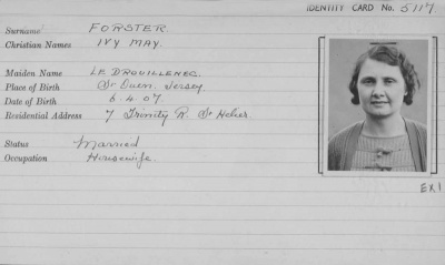 Born in 1907, the daughter of Vincent Le Druillenec and Sainte Francoise Sangan, Ivy Le Druillenec was educated at Les Landes School, St Ouen. She worked with her sister in the family business, La Fontaine Stores, Millais, and then met her husband, Arthur Forster, a soldier in the Duke of Cornwall Light Infantry who was camping at Les Landes.
