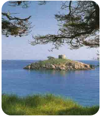 Ile au Guerdain, a rocky islet in Portlet Bay, cut off from the