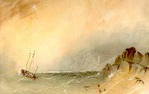 "Along the western coast the glowing colours of the setting sun are reflected from each rocky headland and sandy bay, blending their rich hues with the pearly tints of the rising moon. During the equinoctial gales, the storm-swept sea shivers its wild waves into glittering fragments along the rocky coast, whilst dark grey clouds cast their driving shadows over sea and land. In the Drawings these various effects of sunrise, noon, sunset, twilight, moonlight, and storm, are given."