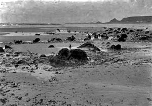 He wrote that there were no geological objections to the theory that the whole low tide area at the Ecréhouse was once dry land and that the presence of peat between low and high tide levels on Jersey's beaches proves that dry land once existed there.
