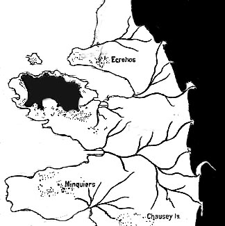 - "Similar lines of argument can be used to suggest that there were some forested lands extending off the coast of the Cotentin and further south to Mont St Michel, which may or may not correlate with the Forest of Scissy. However, there is no strong evidence to indicate that there was anything remotely resembling a causeway in historical times linking either La Rocque or Les Ecréhous to the Cotentin with the only hurdle to be crossed a stream or river. The archaeological and historical investigations carried out at Les Ecréhous recently demand a greater land area there than exists at present, but at its maximum this would never have extended beyond the present low-tide limits. When such of this land as existed was destroyed by the sea is likely to remain imponderable for ever."
