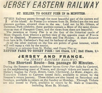In 1873, two years after the Jersey Western Railway opened between St Helier and St Aubin, a new railway serving the east of the island started operations. The line was intended to connect Gorey with a new terminus at Snow Hill, but it opened with temporary termini at Green Street and Gorey Common.