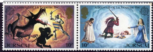 - ↑ Legend says that a terrible dragon once lived in St Lawrence, killing people and burning houses all over the island. The Seigneur de Hambye in Normandy heard of this dragon and set off to fight him. Not much is known about the battle, except that the knight attacked and killed the dragon single-handedly, and cut off its head. Exhausted and wounded, he lay down to rest, while his squire guarded him. But his squire was disloyal, and wanted the glory for himself. He killed his master and buried the body, before returning to Hambye. Once there, he told his master's wife that the dragon had killed the Seigneur, but that he had avenged his death and killed the dragon. As well as this, he added that the Seigneur's dying wish was that the squire should marry his wife. But one night, while they lay in bed, the squire cried out in his sleep, and admitted to killing his master. The lady immediately had him brought to trial, the squire confessed, and he was sentenced to death. The lady then travelled to Jersey, and in St Saviour a mound was raised in memory of the Seigneur - La Hougue de Hambye (Hougue Bie)