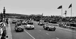 The front of the grid in 1952 - two Jaguar XK120s on the left, driven by Bill Dobson and Jack Hemsworth, then Reg Parnell's Aston Martin DB3, with Oscar Moore's HWM-Jaguar on the right