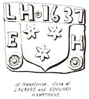 The Hamptonne arms of three stars appear on a stone dated 1637 at Hamptonne Farm, St Lawrence, and also on porch pillars on the old house inside the courtyard there.