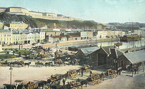 As soon as they had been lifted the potatoes were taken by horse and van to the Weighbridge at St Helier, three columns of farm vehicles converging from the north west and east. The potatoes were weighed and then taken to one of the many merchant's stores along the Esplanade before being shipped out of the island.