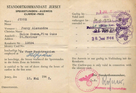 Curfew pass issued to Percy Jenne during the Occupation as a member of the Honorary Police