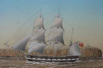 Two paintings of the Constant exist, one formerly owned by John and Peggy Shorrock. On the back was written by Deaconess Kate Hemery (John’s daughter) ‘The ship ‘Constant’ leaving Sydney Heads with John Hemery and his wife on board 1845 – 46’. The figure of a woman with a red parasol can be seen on the deck. Soon afterwards John mortgaged the ship to his father Clement and two of his brothers, Clement and Peter.