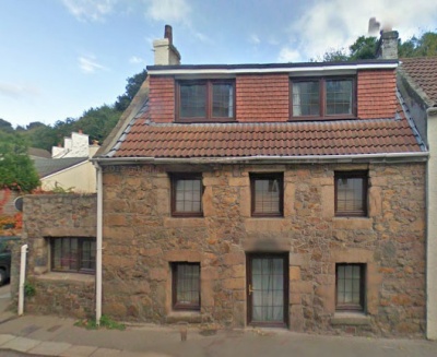 Stone of 1577, incorporated in facade, was carved by Mr Fage, who owned the property in late 20th century. Window apertures increased - lintels and sills. Upper sills show signs of chiselling to increase opening. Front door frame is set back from the batter near the base of facade - a sign of age.