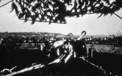 Two photographs of a German anti-tank gun positioned in the grounds of L'Aiguillon during the Occupation
